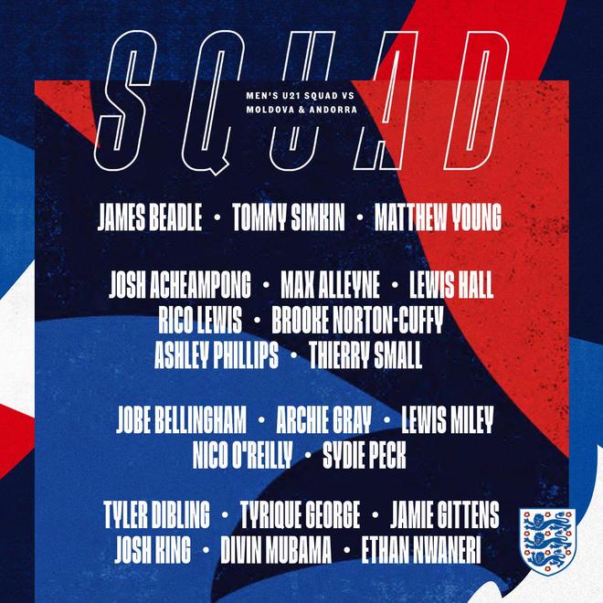 雷速体育10月3日讯 英格兰队官方公布了最新一期U21大名单,他们将在10月接连对阵摩尔多瓦U21、安道尔U21。