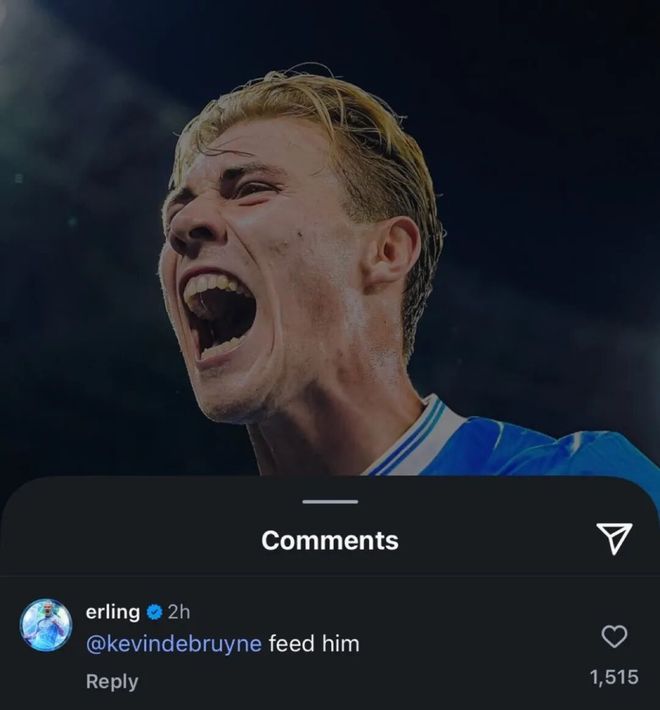 哈兰德回复霍伊伦的Instagram帖子:@kevindebruyne 给他喂饼