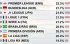 各联赛高速跑动距离占比:英超居首,J1第三,西甲仅第八